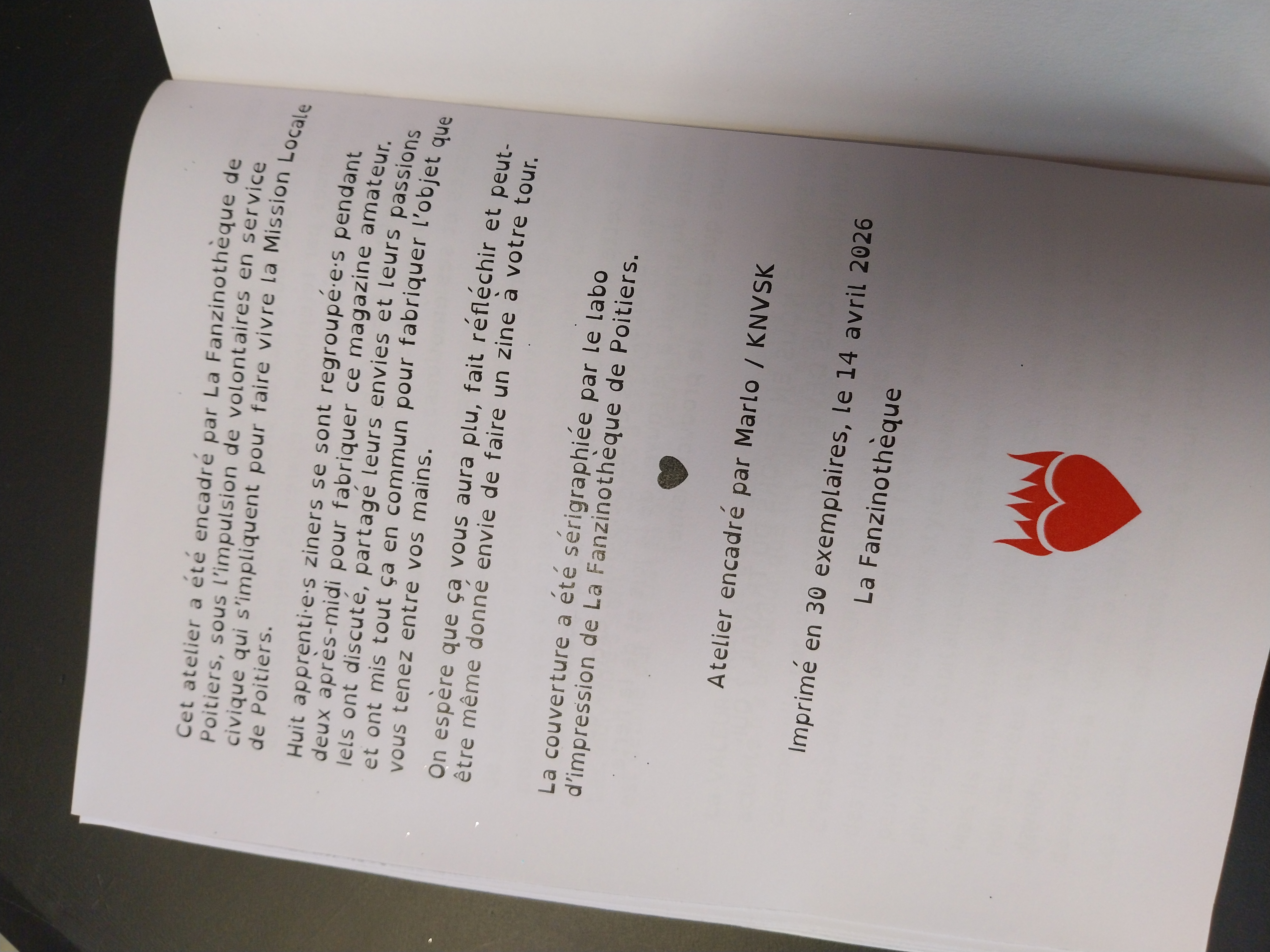 Chaque participant·e·s a pu repartir avec deux exemplaires. Un exemplaire est consultable et empruntable à La Fanzinothèque.